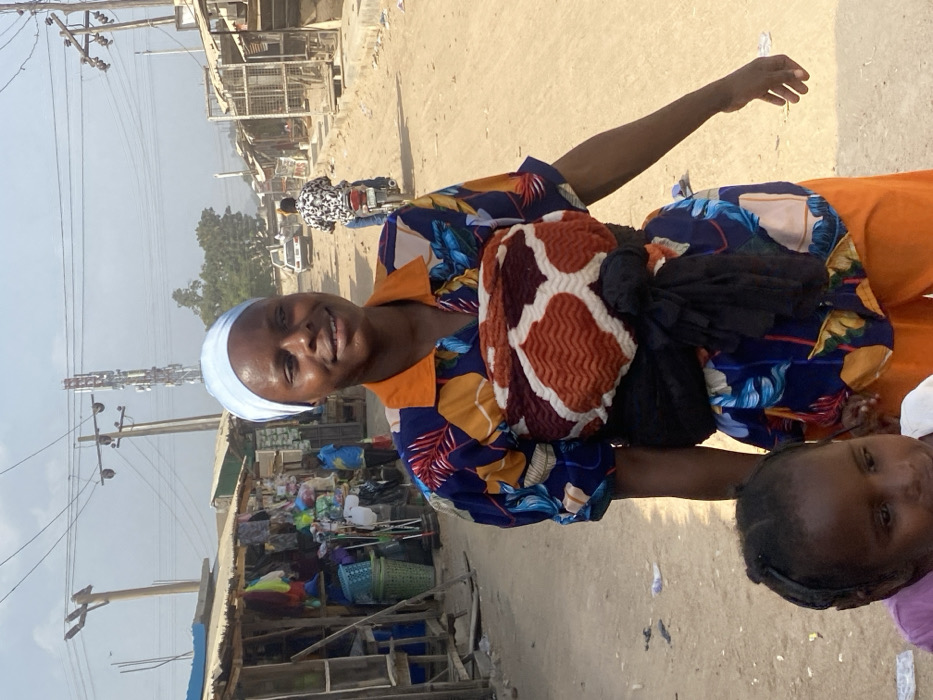 The image depicts an adult female and a young child in the foreground, situated on an unpaved dirt road in the city of Nagazi, Nigeria