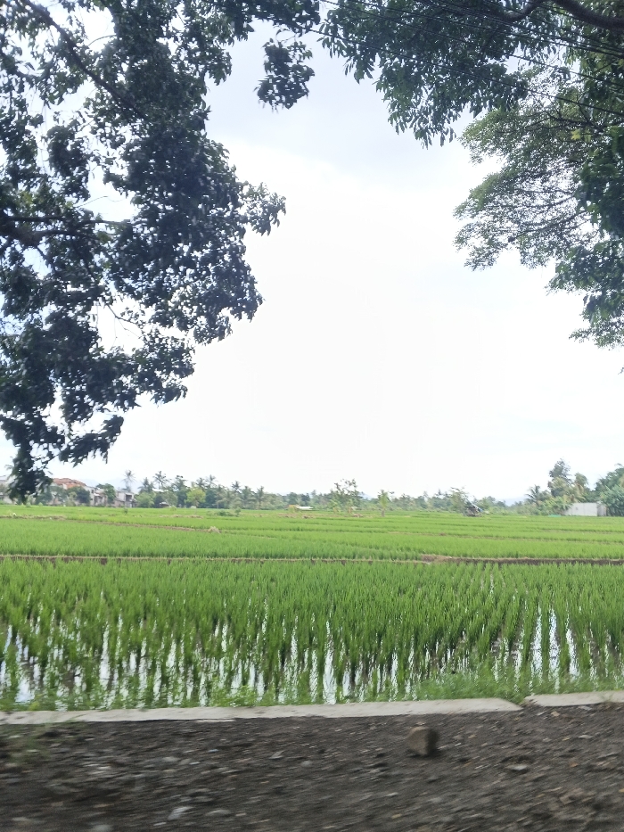 A vibrant green rice paddy stretches toward the horizon under a bright sky. The young rice plants stand in flooded fields, reflecting the light. Mature trees frame the scene, their foliage visible in the upper corners of the image. A low concrete barrier runs along the bottom, leading to a dirt embankment in the immediate foreground. In the distance, structures and scattered trees dot the landscape.