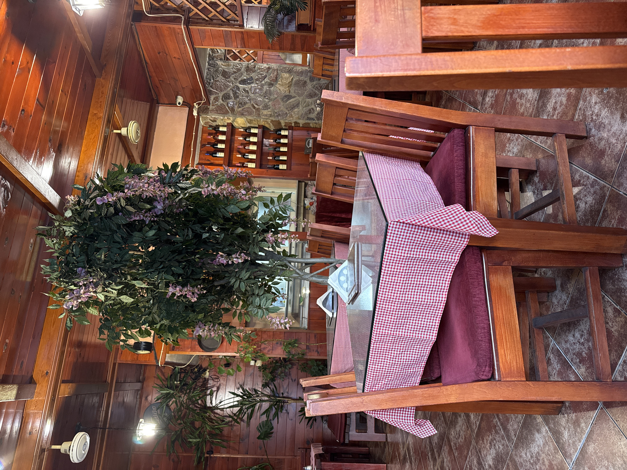This image depicts the interior of an unoccupied restaurant located in Budva, Montenegro. The establishment features a rustic design with dark wooden paneling covering the walls and a planked wooden ceiling. The floor is tiled with mottled brown and beige ceramic. Numerous dining tables are arranged throughout the space. Each table is covered with a red and white checkered tablecloth and topped with a clear glass surface. Accompanying the tables are dark wooden chairs, each fitted with a maroon fabric seat cushion. Some areas also include wooden benches with matching maroon cushions. A large artificial tree, featuring green leaves and clusters of purple, wisteria-like flowers, stands prominently in the center of the visible area. Additional potted green plants are positioned around the room. In the background, a section of wall is clad in natural stone, next to a wooden shelving unit displaying multiple bottles of wine on three separate tiers. Overhead, multiple ceiling fans and various lighting fixtures, including recessed lights and pendant lamps, are visible. A white security camera (CCTV) is affixed to a wooden wall section in the upper right quadrant of the image. A window is present in the background, and a small sign on a distant table reads "RELAX." No individuals are present in the scene, and no active interactions or ongoing activities are depicted.
