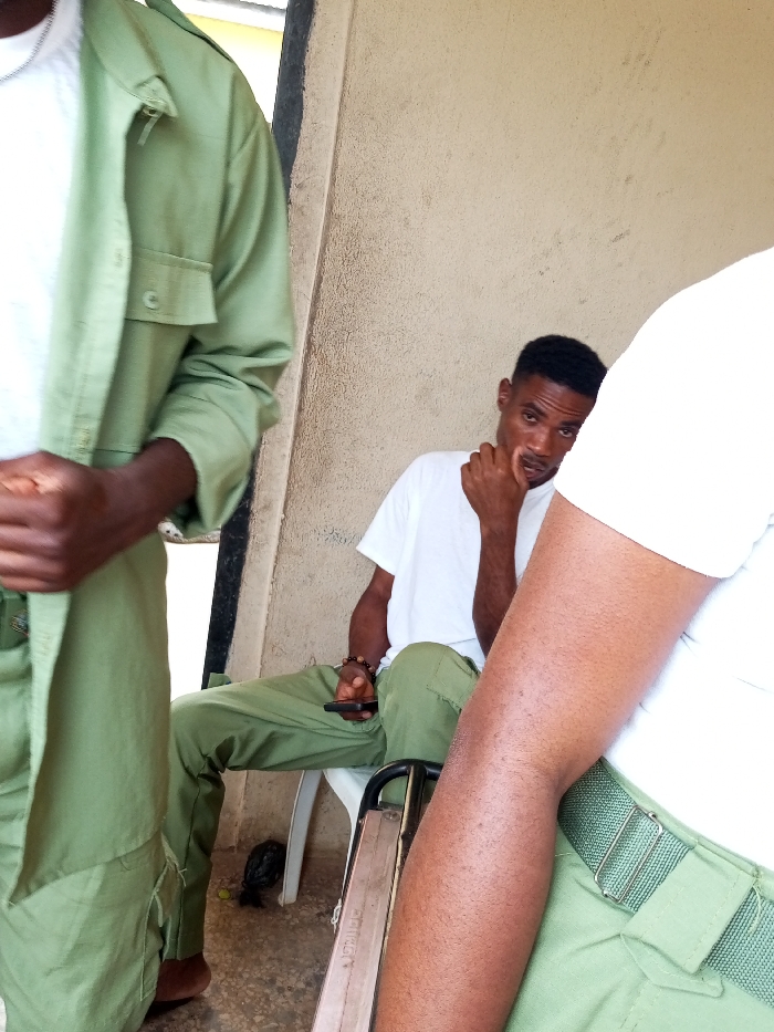 The image depicts three dark-skinned individuals in an indoor or sheltered outdoor setting within Aramoko-Ekiti, Nigeria. On the left, a person is partially visible from the chest down, wearing an unbuttoned light green long-sleeved shirt over a white undershirt and light green trousers. Their hands are clasped at waist level, and they appear to be barefoot. In the center, a male individual is seated on a white plastic chair against a plain light beige concrete wall. He wears a white short-sleeved t-shirt and light green trousers. His right hand is raised to his mouth/chin area, while his left hand holds a black smartphone. A brown beaded bracelet is present on his left wrist. He has short, dark hair and is looking directly towards the camera. On the right, a third individual is partially visible, showing a bare right arm, a white short-sleeved t-shirt, and light green trousers with a matching light green belt and silver buckle. The floor is light-colored, likely concrete. A dark object, possibly a small bag, rests on the floor near the feet of the seated individual. A dark-colored, elongated object, potentially a cricket bat or a structural element, is visible in the bottom right foreground. The overall lighting is uniform and ambient. The light green attire worn by all visible individuals suggests affiliation with the Nigerian Youth Service Corps (NYSC).
