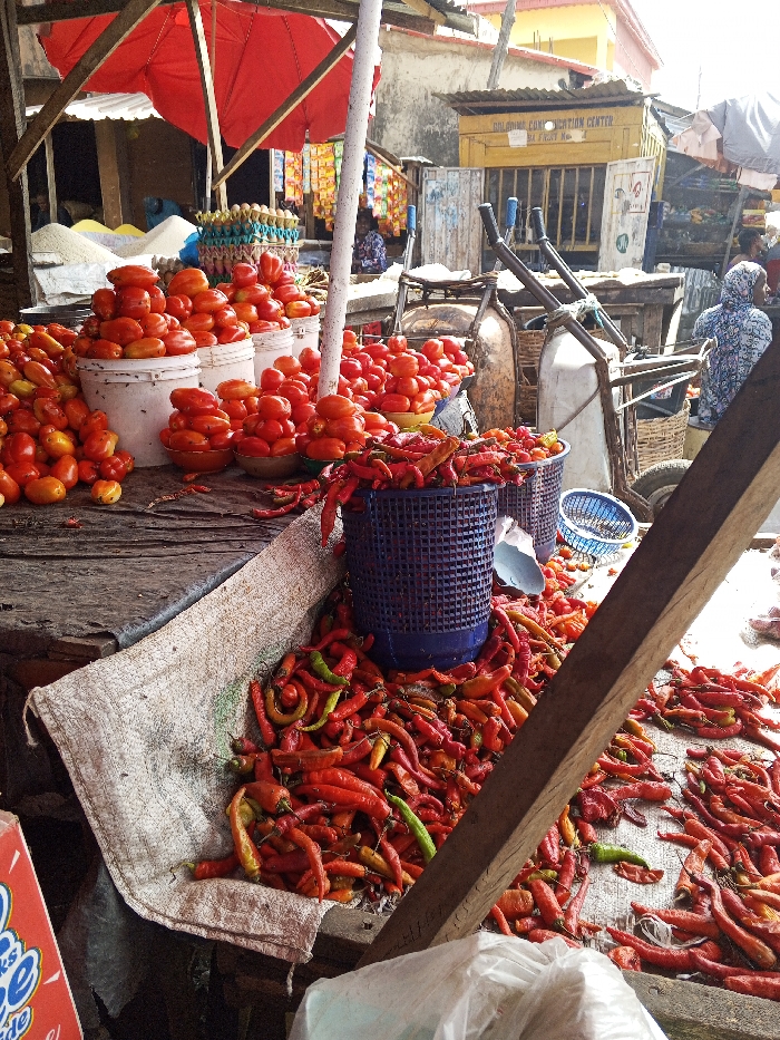 The image displays an outdoor market stall in the City of Unknown, Unknown. The primary focus is on produce, specifically tomatoes and chili peppers. In the foreground, red and some green chili peppers are spread across a light-colored burlap sack and dark wooden planks. Several dark blue perforated plastic baskets, some overflowing, also contain chili peppers. To the left, numerous red and orange tomatoes are vertically stacked in white plastic buckets and bowls on a wooden table. A large red market umbrella extends over the left side of the stall, providing shade. In the background, large white piles of grain are visible on the far left, and eggs are displayed in colorful woven carriers behind the tomato stacks. A yellow structure labeled "SOLOMON COMMUNICATION CENTER" with partially visible text "D. H. G. Project No. 3" stands in the middle-background, behind other market structures. A metal hand truck with blue handles is parked in the middle ground, right of center. Two individuals are present: one person wearing a light blue and white patterned head covering and garment is partially visible from behind, near the hand truck, facing away from the camera. Another person in a dark, patterned garment is partially visible in the left-center background, positioned behind the tomato display. The scene is illuminated by daylight, suggesting an active commercial environment.