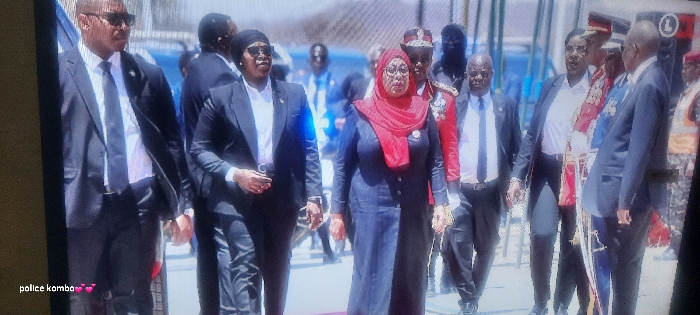An outdoor scene in Nairobi, Kenya, depicting a formal procession under bright daylight. The central figure is a woman identified as Samia Suluhu Hassan, President of Tanzania, wearing a dark blue long dress, a red hijab, and spectacles, walking forward. She is flanked by security and dignitaries. To her immediate left, a woman in a dark suit, white shirt, and sunglasses walks slightly ahead. Further left, a man in a dark suit, white shirt, black tie, and sunglasses is visible. To her immediate right, a male military official in a red and gold ceremonial uniform with a peaked cap walks alongside. Other male officials in dark suits and uniforms are present in the background, forming an entourage. The ground is paved, and the background shows blurred structures and open space, consistent with a formal arrival or departure ceremony at an official location such as Jomo Kenyatta International Airport (JKIA) or State House Nairobi. All individuals are in motion, walking from left to right across the frame.