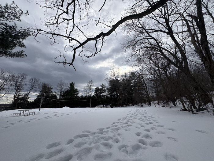 A snow-covered landscape under a cloudy sky features a volleyball net and picnic table in the distance. Footprints mark a path across the snow-covered ground, leading towards a line of trees in the midground. Bare branches reach across the top of the frame. The scene evokes a sense of stillness and coldness in a winter setting.