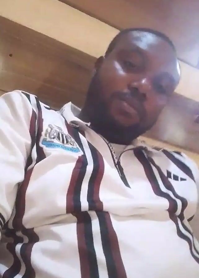 A close-up, medium shot of a man with dark hair and a beard wearing a white and striped collared shirt with a badge, appearing to make a hand gesture, likely a peace sign or "V". The background includes beige walls and an indistinct dark wooden object.