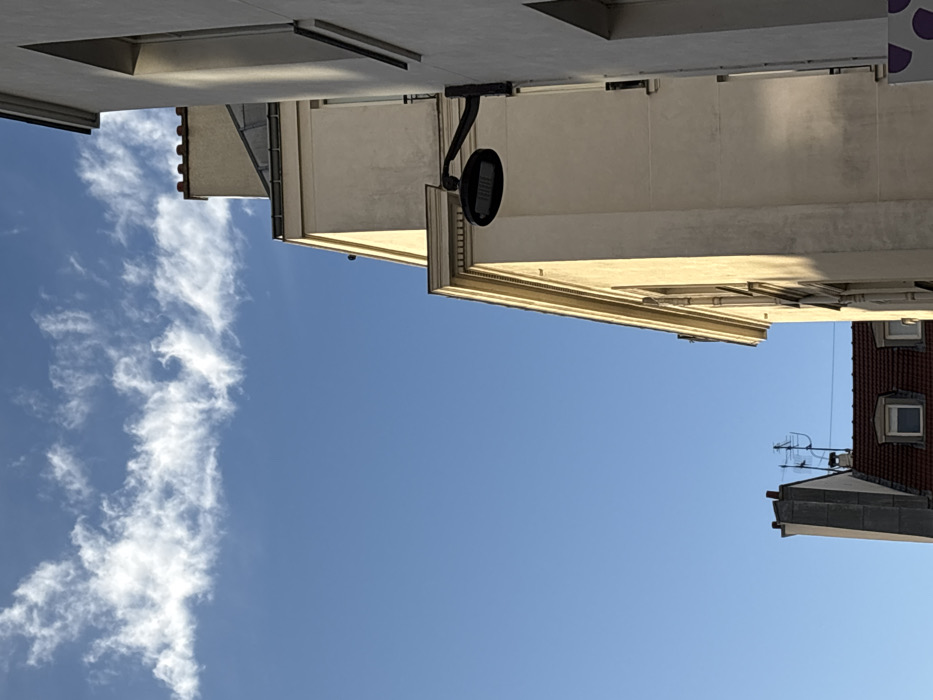 The image presents an upward-angled view of urban architecture against a clear blue sky in Paris, France. A single, elongated white cloud streaks horizontally across the upper left quadrant of the vibrant blue sky. In the foreground, a light-colored, possibly cream-toned building facade occupies the right side of the frame, illuminated by direct sunlight from the left. A black, oval-shaped LED street lamp is prominently mounted on this facade, positioned below a decorative cornice. Further back and to the lower left, a second building features a visible red-tiled pitched roof, at least two dormer windows, a gray chimney stack, and a multi-directional television antenna. No individuals, actions, or interactions are depicted.
