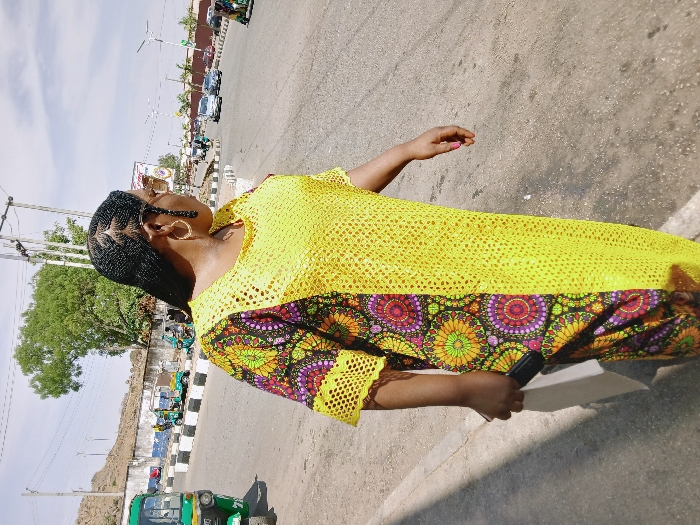 The image displays an outdoor scene on a paved road in Communauté rurale de Payar, Senegal, under clear daylight. A woman, positioned in the foreground, is partially turned away from the camera, looking towards the right. She has braided black hair styled with intricate patterns on the side, wears large gold hoop earrings, and light-framed eyeglasses. Her attire is a long dress, vertically divided, with one side composed of a bright yellow open-knit fabric and the other side featuring a dark fabric patterned with vibrant, multicolored concentric circles. She holds a dark object in her left hand; her right hand exhibits pink nail polish. The background reveals a multi-lane asphalt road with a black and white striped curb or median. Various vehicles, including a green auto-rickshaw on the immediate left, other smaller vehicles, and multiple cars, are present on the road. A low concrete wall separates the road from a rocky hillside and scattered green trees. Utility poles and streetlights are also visible against the sky.