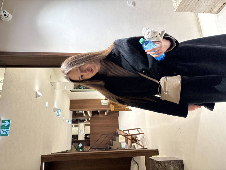 An indoor scene depicts a young adult female standing in a high-end retail environment. The location is identified as the Hermès Paris George V boutique, situated at 42 Avenue George V, 75008 Paris, France. The subject is a Caucasian female, approximately 20-30 years old, with long, straight, brown hair. She is wearing a dark, likely black, long coat over a light brown turtleneck sweater. A small, light taupe, structured handbag with a top handle and cross-body strap is worn on her left side. In her left hand, she holds a blue plastic water bottle with a green cap, and a small, light-colored plush item, possibly an animal head. Her lips are pursed, and she is looking directly towards the camera. The environment features a modern, minimalist design with light-colored walls and flooring, possibly polished concrete or stone. Recessed lighting illuminates the ceiling, where two green European-standard emergency exit signs (running man with a down arrow) are visible. A white dome-shaped security camera is mounted on the upper right wall. The background on the left showcases interior architectural elements including extensive natural wood paneling, open shelving, and a prominent wooden staircase with dark treads. A light-colored folding wooden chair and a section with a padded bench are also visible near the staircase. Reflective surfaces, possibly mirrors, are integrated into the wall design, reflecting parts of the interior. A light-colored, block-like display pedestal or furniture item is partially visible in the foreground on the right.
