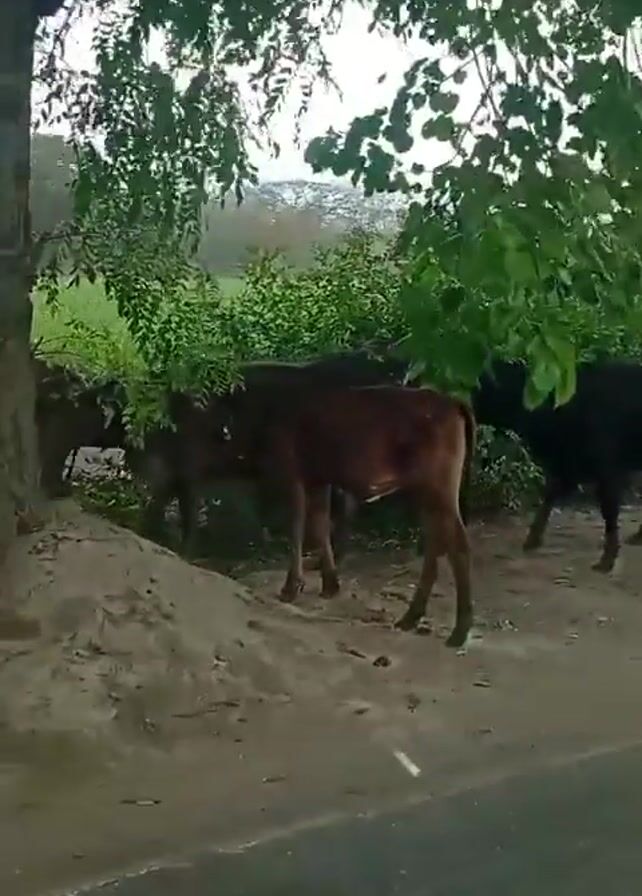 several cows near a tree, as seen from a moving vehicle. The cows are brown and black. They are near a dirt area with green bushes and trees in the background. The vehicle appears to be blue, with its roof and window visible in the frame.