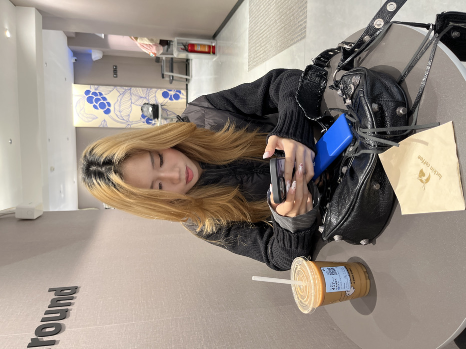 A woman with blonde hair sits at a round table, holding a phone with painted nails. A black purse and a blue power bank rest on the table next to her. A cup of iced coffee with a straw sits close to her arm. A tan-colored paper bag with the words "luckin coffee" is next to the purse. The word "around" is written on the wall behind the table. The background shows a hallway with a fire extinguisher and a decorated wall.