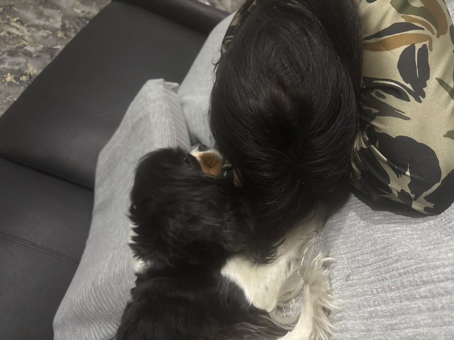- "A Cavalier King Charles Spaniel with black and white fur rests comfortably next to a person's head" by FM-jgPhH3, licensed under CC BY 4.0