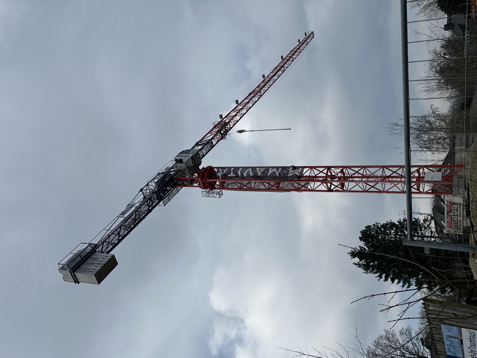 A red tower crane dominates the frame at a construction site in Grünwald, Germany, set against an overcast sky