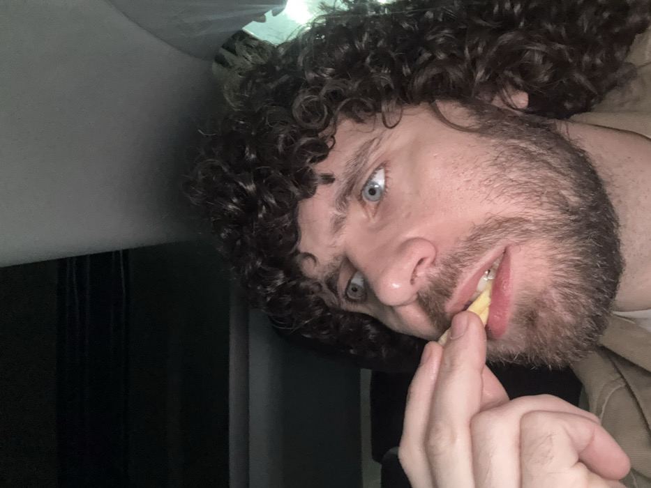 An adult male with dark, curly hair and a beard is depicted in a close-up, angled shot. He possesses light blue eyes and is looking upwards and to the right of the frame. The individual is in the process of consuming a light-colored, elongated food item, possibly a french fry or potato wedge, which he is holding with his right hand and inserting into his slightly open mouth. He is wearing a tan or light brown outer garment over a lighter-colored undershirt. The immediate background is dimly lit and suggests an interior space, with a dark, textured surface visible above and behind his head, consistent with a vehicle's ceiling. A distinct, bright greenish-white light source is visible on the far right. The scene is located in the city of Pushkino, Russia.