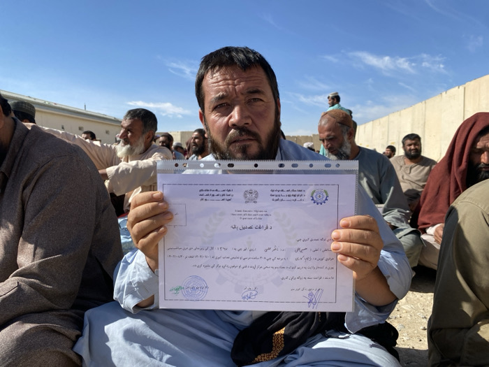 This image depicts an outdoor gathering in Mandisar, Afghanistan, under a clear blue sky. A man in his 30s or 40s, with dark hair, a beard, and a mustache, is prominently featured in the foreground, seated on dry, light-colored earth. He wears a light blue traditional Afghan garment and looks directly forward with a somber expression. He holds a laminated white document, which appears to be an official application for aid titled "درخواست کمک بلاعوض" (Request for Non-Refundable Aid), displaying text in Dari or Pashto, official seals, and handwritten marks. Behind him, a dense crowd of approximately two dozen men, similarly dressed in traditional attire, are seated on the ground, extending into the mid-ground. Many have beards; their postures and gazes vary, some looking towards the front, others away. In the background, a tall, beige concrete wall spans horizontally, with a light-colored building structure partially visible beyond it to the left. The ground throughout the scene is dry and dusty.