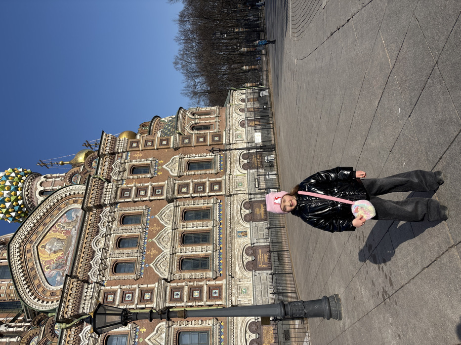 A young child stands centered in the foreground on a grey paved plaza, smiling directly at the camera. The child is wearing a pink knitted hat with a white motif, a shiny black puffer jacket, dark wide-leg trousers, and dark shoes. A small, round, multi-colored pastel crossbody bag with a pink strap is worn over the right shoulder. To the child's left, a tall, black, ornate street lamp post is visible. Behind the child and the lamp post is the highly ornate facade of the Church of the Savior on Spilled Blood, located in Saint Petersburg, Russia. The church exhibits intricate brickwork and decorative white stone detailing, numerous arched windows, and visible mosaic panels, including a large depiction of Christ in glory on an upper arch. Golden domes and a multi-colored, geometrically patterned onion dome are visible on the upper section of the church. A black metal fence runs along the base of the church, separating it from the paved area. To the right of the child, the paved plaza extends into the distance, bordered by bare deciduous trees, suggesting late autumn, winter, or early spring. Several indistinct figures, including one child in a blue jacket, are visible further back in the plaza area. The sky above is clear and bright blue, casting distinct shadows from the child and the lamp post onto the pavement, indicating sunny weather.
