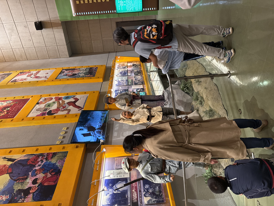 The image depicts an interior scene at the China National Film Museum, located in Chaoyang District, Beijing, China. Multiple museum visitors are observing historical exhibits within a high-ceilinged hall. The environment features tall, light grey concrete walls with exposed texture. The floor is a smooth, polished light green/beige material reflecting overhead lights. Dominating the upper wall space are several large, vertical displays framed in bright yellow, designed to resemble film reels, each containing vibrant vintage Chinese movie posters. A rectangular flat-screen monitor is mounted on the wall between these film reel displays, showing a dark blue-toned video scene. At ground level, a glass-enclosed diorama is visible, depicting a rugged outdoor scene with simulated rocks and sparse green vegetation. Inside the diorama are three young male mannequins. On the far left, a mannequin dressed in a grey military-style uniform with a peaked cap and red star insignia holds a rifle with a bayonet. To its right, another mannequin in light-colored traditional clothing stands on a rock, with its right arm raised in a clenched fist gesture. Further right, a third mannequin in traditional clothing stands behind the raised-arm figure, holding a scroll or book. Behind the diorama, a series of smaller framed black-and-white photographs and text panels are displayed on a back wall, illuminated by individual spotlights. A metal railing separates the viewing area from the diorama. Four individuals are visible in the foreground and mid-ground. On the far left, a young child in a dark blue top is crouching, facing the diorama. Next to the child, a female adult with dark hair tied back, wearing a long beige trench coat, blue jeans, and light shoes, stands facing slightly left, observing the diorama. She carries a light-colored handbag. In the mid-ground right, an adult male with grey hair, wearing a light blue polo shirt, light trousers, and athletic shoes, stands with his back to the camera, observing the exhibits. He wears a black backpack featuring a red and black cartoon character design. Standing to his left, a young child in a light blue top is also observing the displays, with the adult male's hand resting on the child's shoulder. A partial view of another individual in a light grey top is visible on the far right.