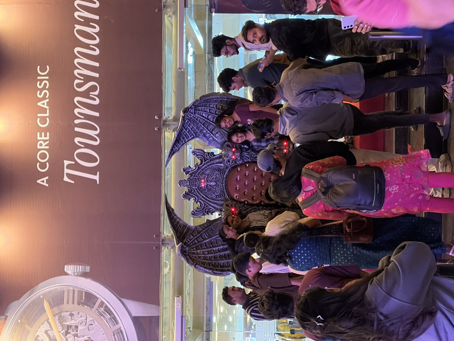 The image depicts an indoor promotional display within a shopping mall in Bengaluru, India. An overhead banner advertises "A CORE CLASSIC Townsman" alongside an image of a skeleton-dial wristwatch. The central feature is a dark-grey, ornate throne with prominent, wing-like side extensions and multiple red illuminated elements resembling eyes on its armrests and headrest. The throne's seat is red and tufted. Approximately 15 to 20 individuals, primarily young adults, are gathered around the display. Three women are seated on the throne, posing and smiling. Other individuals stand nearby, observing or interacting, with one person on the right holding a smartphone, seemingly capturing the scene. The display is situated on a low, stepped platform under artificial lighting, with reflections from a glass partition visible in the background.