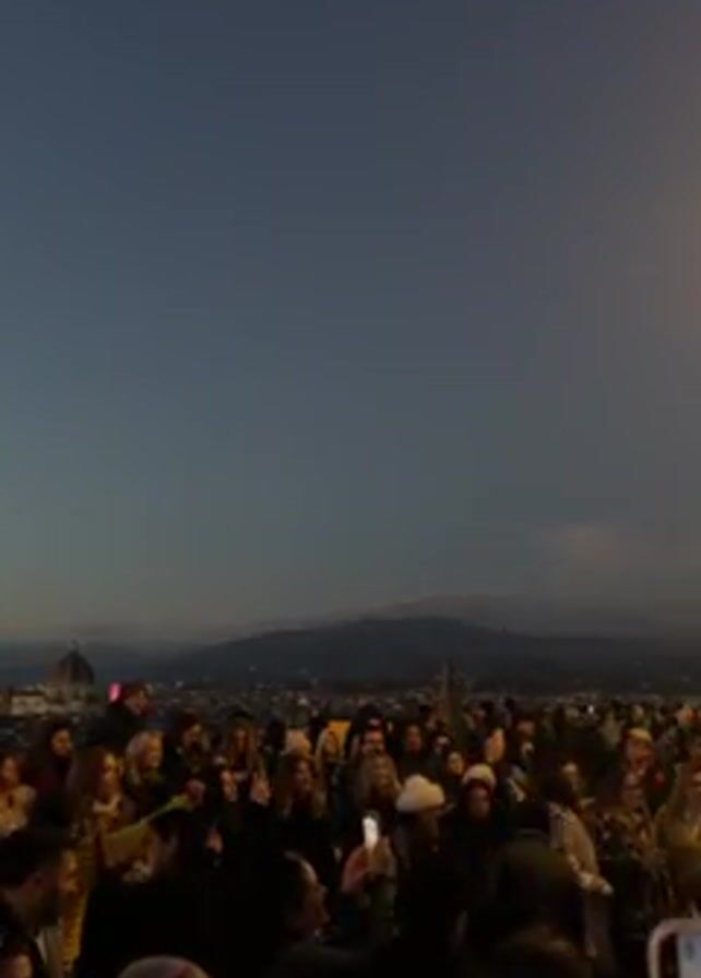 large crowd of people gathered on a hill or elevated area at dusk. The sky is a deep blue, transitioning to a lighter hue near the horizon. In the distance, there is a cityscape with a prominent dome-shaped building and a spire, likely indicating a notable city like Florence. A mountain range is visible behind the city. The crowd is diverse, with people of various ages and styles of clothing. Some are holding up their phones, presumably to take photos or videos of the view. There is a streetlight visible on the right side of the frame. The overall atmosphere suggests a public gathering or viewpoint where people are enjoying the scenic view.