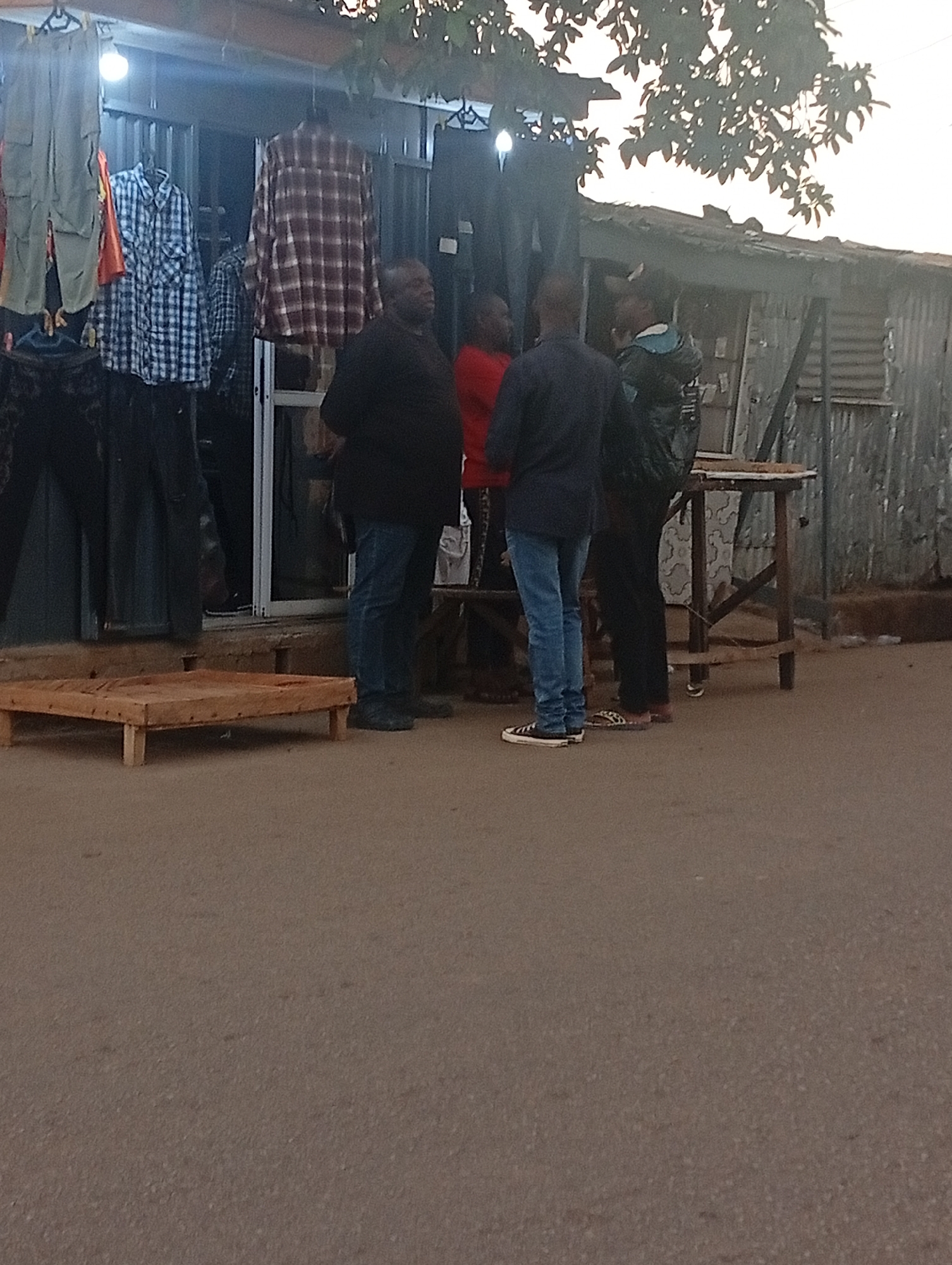 Four people stand in front of a small storefront with metal siding in Jos, Nigeria. Clothing hangs in the storefront, and a small wooden pallet sits on the street in front. Three men face each other in a conversation, while the fourth man stands further back. A wooden table is visible to the right of the men. A tree hangs over the storefront and the street. The street is a reddish-brown color.