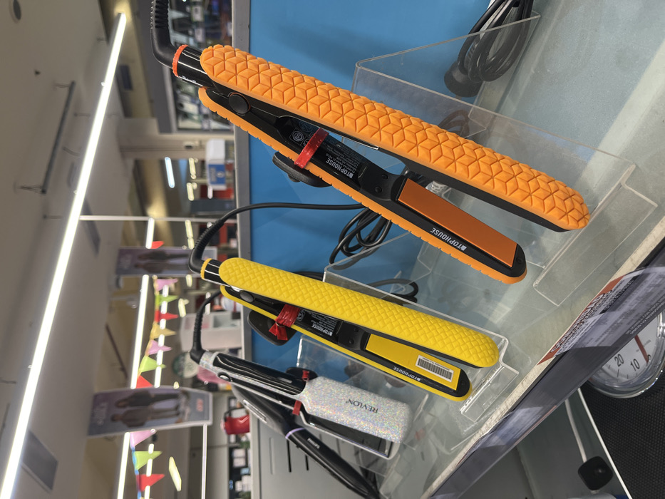 Three hair straighteners are displayed on a shelf. The top one is orange with a geometric pattern. The second one is yellow with a similar geometric pattern. The bottom one is a Revlon straightener with a glittery finish. All three are attached to the shelf with red tape. The shelves are clear plastic, and there is a clock and other store merchandise visible in the background.