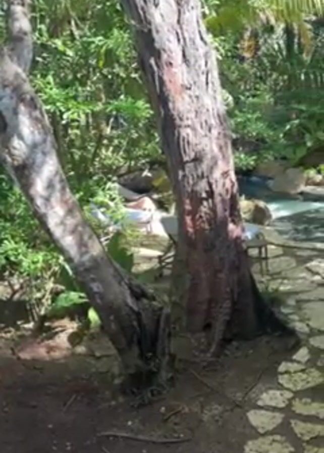 The camera slowly pans right to show a stone-paved path leading to a clear pool of water in a wooded area. There are two trees on either side of the path in the foreground, and the camera slowly reveals the scene of a pool of water surrounded by lush greenery. There are two lounge chairs next to the water, and a person lying on one of the chairs. The water seems still and serene. The environment suggests a tranquil and secluded spot.