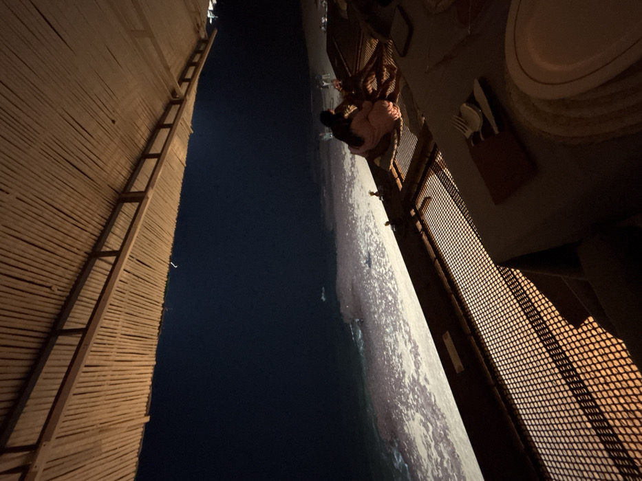 This image depicts a nighttime scene at an elevated, open-air establishment overlooking a beach and ocean in Anjuna, India. The ceiling of the structure is constructed from closely spaced bamboo slats supported by wooden beams, illuminated from below. In the midground, a person, possibly female, with long dark hair, dressed in light-colored attire (appearing pink), sits cross-legged on a cushion or low seating area at the edge of the elevated platform, facing the dark ocean. Their bare feet are visible. The platform features a large netted or hammock-style seating area extending towards the beach, casting shadows from the overhead lighting. In the immediate foreground, the corner of a table set for dining is visible. The table is covered with a grey tablecloth. A round white plate rests on a circular woven placemat. A fork and knife are presented in a dark brown or red fabric holder beside the plate. A portion of an arm or shoulder belonging to an individual seated at this table is visible on the far right. Beyond the platform, a sandy beach extends, illuminated by an unseen light source, with white-capped waves breaking at the shoreline. Several indistinct figures are discernible on the beach or in the shallow water in the distance. The sky above the horizon is dark and clear, suggesting a cloudless night.