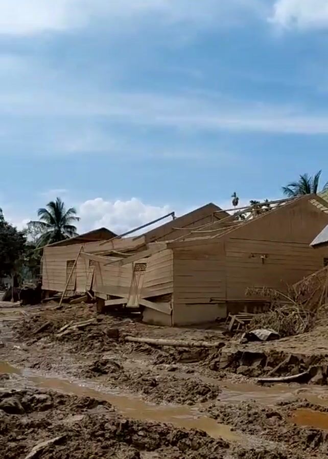 aftermath of a natural disaster, likely a mudslide or flood, in a tropical region. Wooden houses are heavily damaged or destroyed, with mud and debris covering the landscape. There are palm trees present. The ground is covered in thick mud and debris. In some shots, people can be seen walking around, assessing the damage and potentially clearing debris. One man is wearing a vest with the word "BAZNAS" on it. The sky is visible with varying degrees of cloud cover, and the weather appears to be sunny. The overall scene conveys a sense of destruction and the need for recovery efforts.