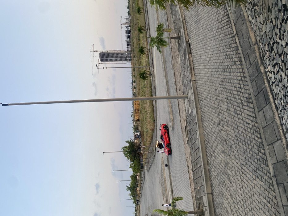 An elevated view of a paved road flanked by undeveloped land and construction. A red sports car is parked on the side of the road, and two people stand beside it. Palm trees line the road, with light poles extending into the sky. A tall building under construction is visible in the distance, cranes hovering over the site. The sky is clear and light blue. The edge of a paved walkway with a rock border is also visible.