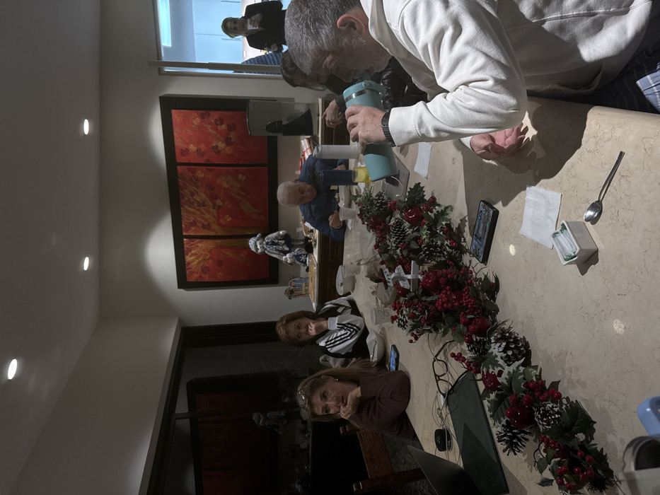 A group gathers around a long table adorned with a festive Christmas garland. A man pours juice from a light blue container. Several people are seated, including two women facing the camera. A painting hangs on the wall behind them. A spoon, a tissue box, and a phone are placed on the table near the garland. A person is seen in the background near a window.