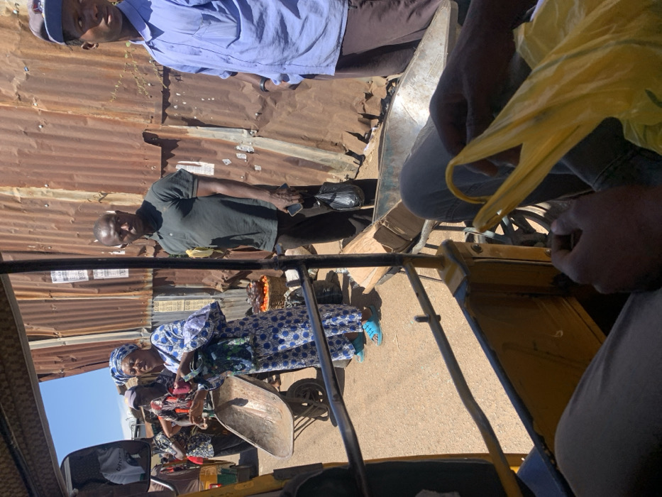 The image depicts an outdoor urban market scene in Jos, Nigeria, viewed from the interior of a yellow motorized rickshaw
