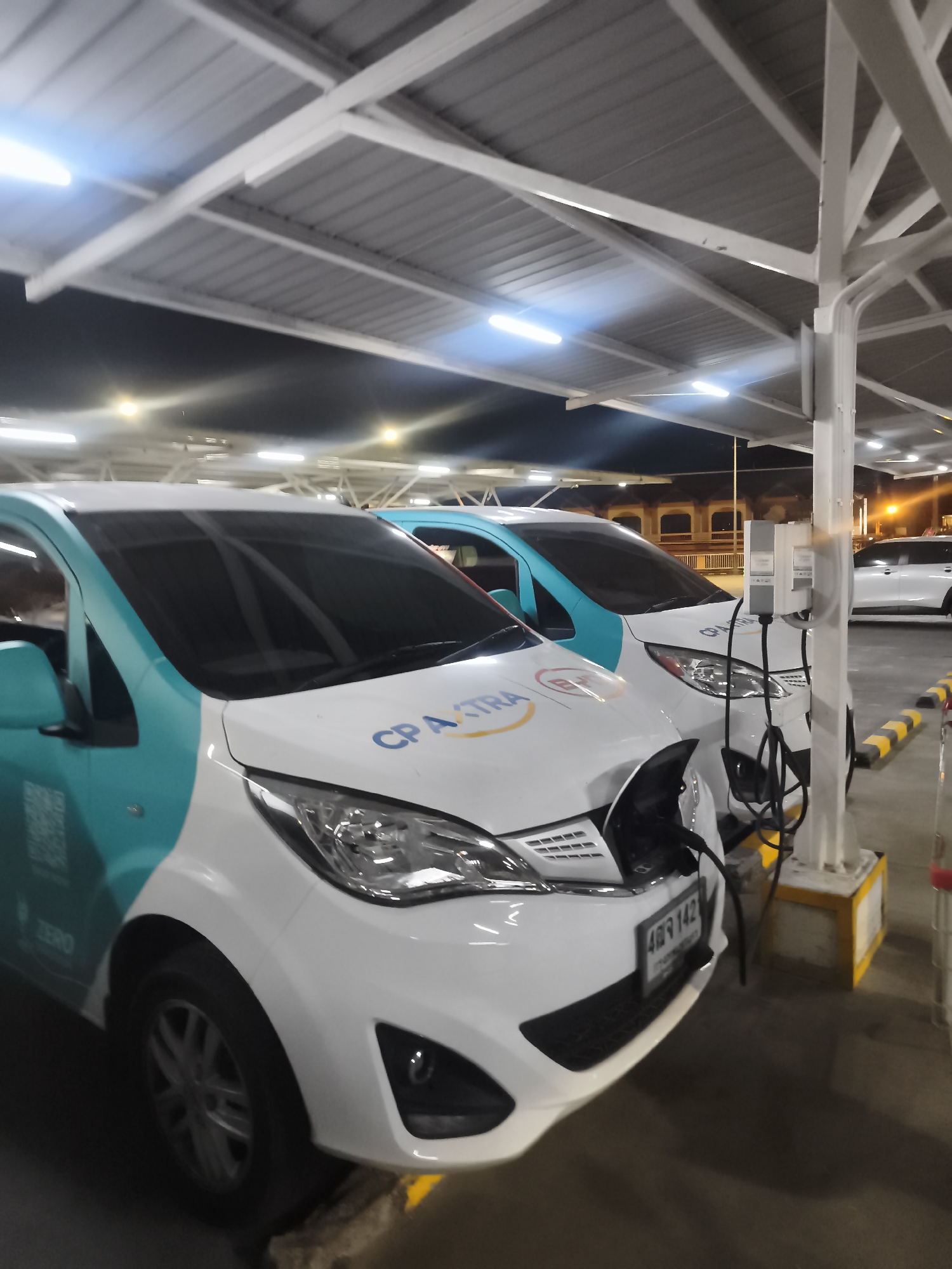 Two electric vehicles, white with turquoise accents, are parked at charging stations under a covered structure. "CP ASTRA" is visible on the side of one vehicle, which is plugged into a charging station. The license plate of the closest vehicle reads "4จช 142". The location appears to be a parking garage with overhead lighting. Baan Bo Phut, Thailand is not discernible.