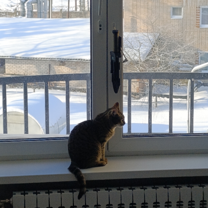 This image presents a winter exterior view from an interior vantage point in Hlybokaye, Belarus. A brown tabby cat is seated on a white windowsill in the foreground, facing right and gazing outward. Below the sill, a white panel radiator is installed. A dark, sheathed knife hangs vertically from the white PVC window frame's locking handle. The outdoor environment is heavily snow-covered. A dark metal balcony railing, partially obscured by snow, is visible directly beyond the window. To the left, a light-colored brick building with a snow-covered roof and a partial view of a white dome structure are present. To the right, another light-colored brick building features multiple windows. Bare deciduous trees and shrubs, showing signs of frost, are dispersed across the snow-covered landscape. Icicles are suspended from an unseen structure above the outdoor scene on the right. The day is clear and sunny, indicated by bright illumination and crisp shadows on the snow.