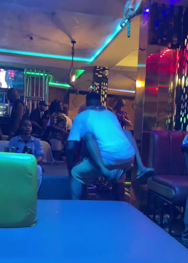 man in a white shirt and khaki shorts giving a woman in an orange shirt a piggyback ride in a dimly lit, crowded bar. The bar has a distinctive decorative style, featuring blue and green neon lighting, a faux monkey hanging from a rope, and patterned columns. Other patrons are visible in the background, seated at tables and standing near the bar. The camera is positioned behind a table, offering a view of the man carrying the woman as they move through the space.