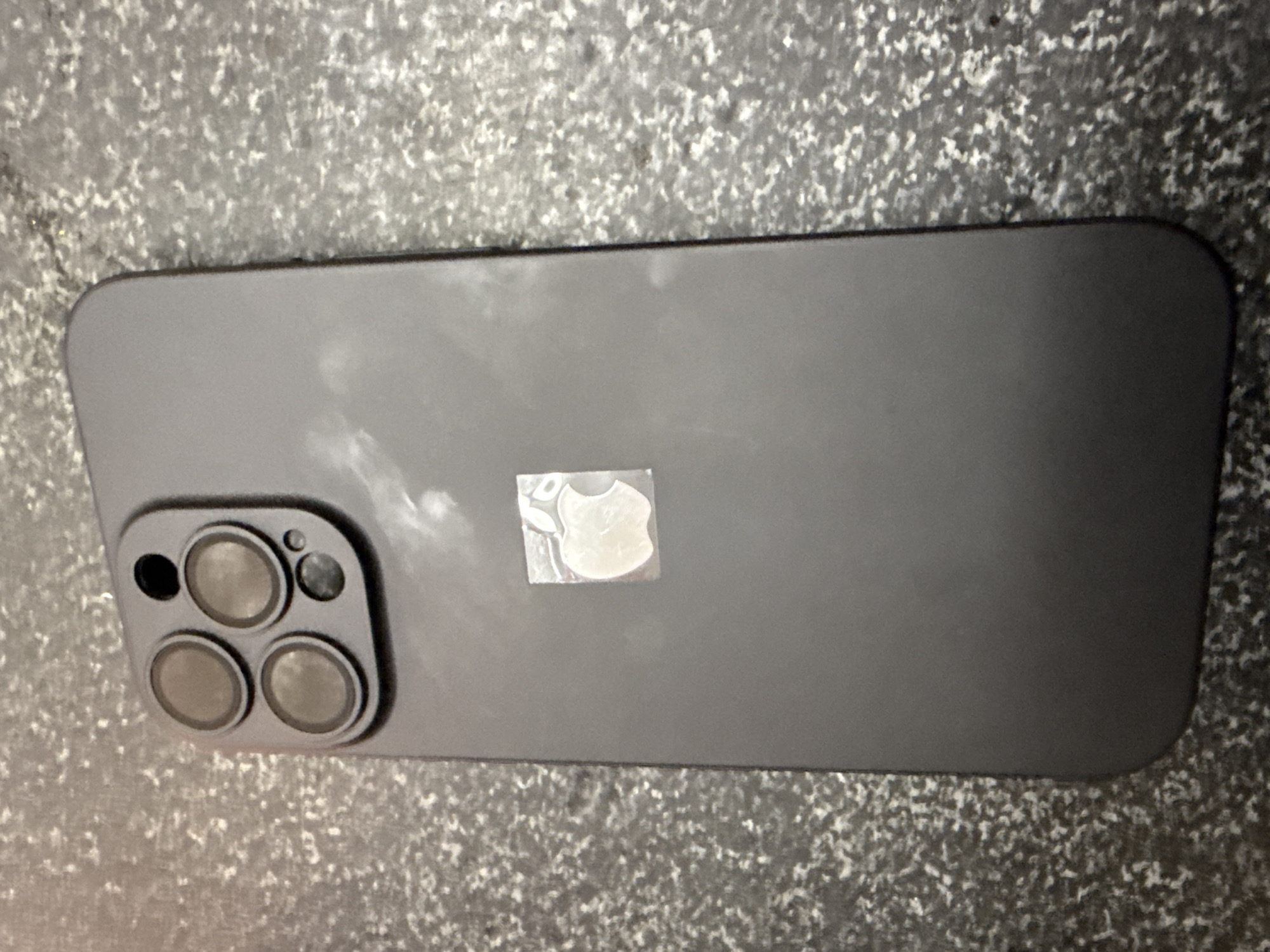 back of a black cell phone, likely an iPhone, lying on a gray, mottled surface