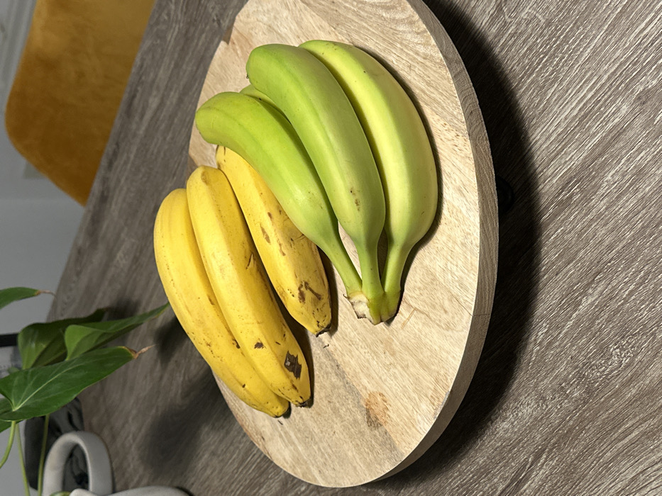 This image, located in an unspecified indoor residence within Wanneperveen, Netherlands, presents a static display of bananas on a wooden surface. A circular, light-toned wooden serving platter, approximately 30-40 cm in diameter and exhibiting visible wood grain and minor surface marks, occupies the central foreground. Positioned on the upper left portion of this platter are four ripe or nearly ripe bananas with predominantly yellow peels, displaying some small brown speckling. On the lower right portion of the platter are four unripe bananas with vibrant green peels, clustered together by their visible stems. The platter rests on a dark brown or gray table surface featuring a distinct wood grain pattern. In the blurred background to the left, a portion of a green plant with broad leaves is visible, along with a fragment of a white plant pot. To the right in the background, a section of a mustard yellow upholstered chair is present. No individuals are depicted. The scene is illuminated by ambient light, creating subtle shadows.
