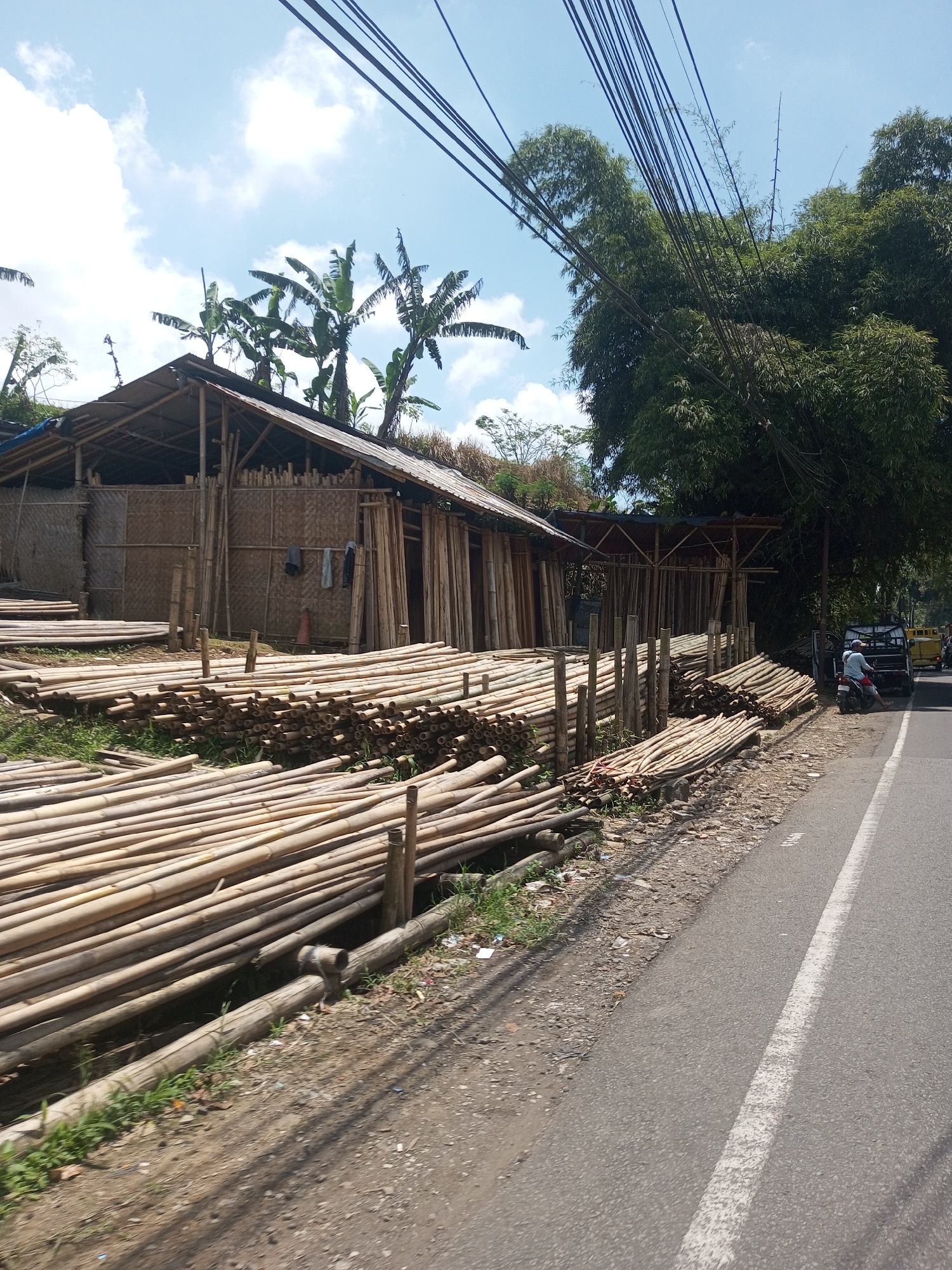 A daytime scene shows a roadside bamboo supply business, likely in a rural or semi-rural area, located in Kioumaknao 2, Laos. A simple, open-air structure, built from bamboo, serves as a storage and sales area. Bundles of cut bamboo poles are stacked in abundance both within and outside of the structure, extending towards the edge of the paved road. Palm trees and other tropical vegetation are visible behind the building. Overhead power lines crisscross the sky. A motorcyclist wearing a white shirt and brown pants is stopped on the road next to a pickup truck. A yellow vehicle follows behind. The road itself is asphalt, marked with a white center line. The weather appears to be sunny with scattered clouds.