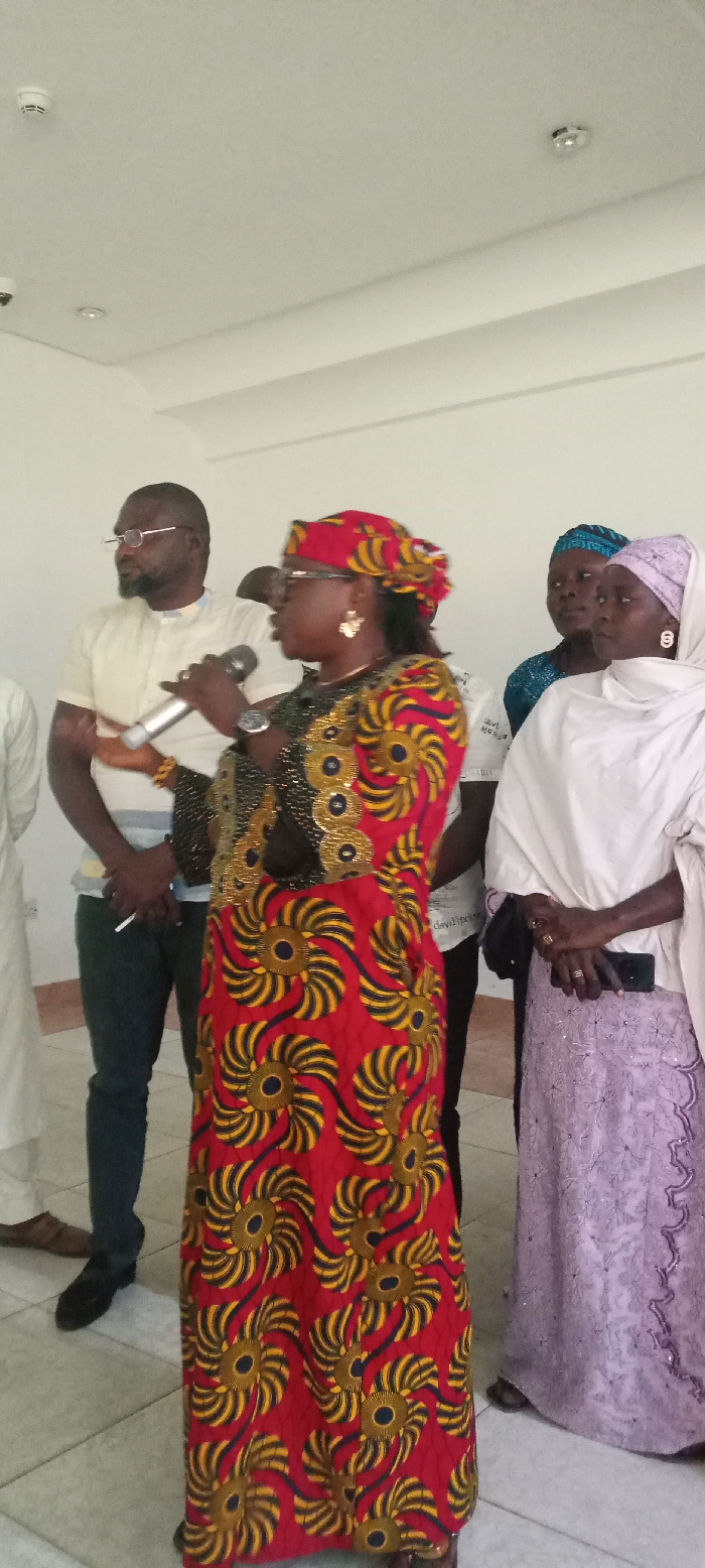 An indoor scene in Yola, Nigeria, depicts a gathering of five identifiable individuals. A woman positioned centrally, facing slightly left of the camera, is actively speaking into a silver and black microphone held in her right hand, her left hand partially raised in a gesture. She wears a vibrant red dress or gown adorned with yellow and blue spiral patterns, a matching headwrap, glasses, earrings, and a watch. The upper part of her garment features elaborate gold and black embellishments. To her immediate left stands a man with a dark beard and glasses, wearing a cream short-sleeved shirt with a patterned collar and dark trousers. His arms are crossed, with a white object, possibly a pen or cigarette, held in his left hand. He wears a yellow beaded bracelet on his left wrist. To the speaking woman's right, a woman in a white headscarf and a light purple, intricately embroidered gown holds a dark smartphone in her left hand, which rests upon her right hand. Rings are visible on her fingers. Partially visible between these two women are two other individuals: one with a blue patterned head covering and another largely obscured. The environment features plain white walls and a white ceiling with recessed lighting and a smoke detector. The floor is covered with light-colored tiles.