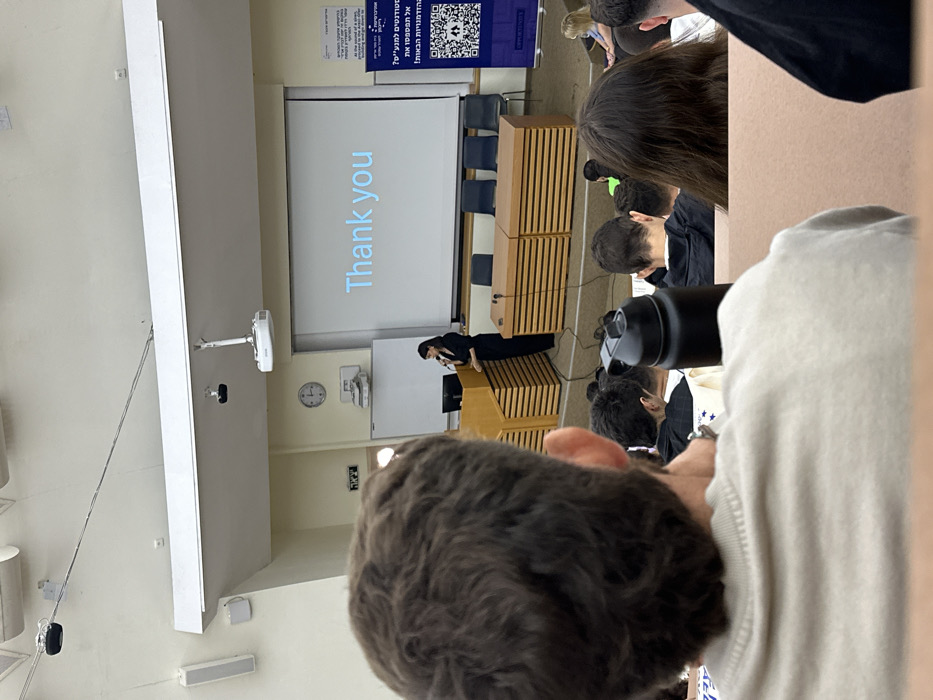 This image depicts a lecture hall at Reichman University (formerly IDC Herzliya) in Herzliya, Israel. A female speaker, dressed in a dark pantsuit, stands behind a wooden podium on a stage, holding a microphone in her left hand, appearing to conclude a presentation. A large white projection screen behind her displays the text "Thank you" in light blue. To the right of the screen, a blue and white banner with Hebrew text, including "Law students" and the university's name, along with a QR code, is visible. On the stage, behind the podium, three wooden tables and four dark chairs are arranged. The audience, composed of numerous individuals, primarily young adults, is seated in rows, facing the stage. The back of a male audience member's head, wearing a light-colored sweatshirt, occupies the immediate foreground. A black insulated water bottle rests on a desk in the mid-foreground. The lecture hall features light-colored walls, a white ceiling with recessed lighting, ceiling-mounted speakers, a projector, and security cameras. A clock, a whiteboard, and a door marked with Hebrew text (likely "Exit") are visible on the left wall.