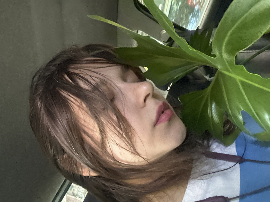 A woman with closed eyes and light skin lies on her side. Brown hair falls over her forehead. Her lips are pink. A large green plant with broad, glossy leaves is next to her head, partially obscuring her face. The background suggests she is inside a car. She wears a white and blue striped top with what appears to be purple headphone wires draped across her shoulder. The image has a slightly soft focus.