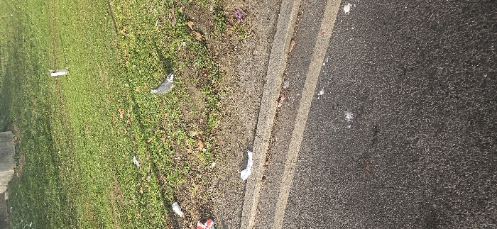 A patch of green grass with litter, including pieces of white debris and a gray object, sits next to a rough patch of dirt. The dirt borders a gray curb and a black asphalt road. The road has sporadic white markings and a double yellow line visible on its surface. The overall scene is untidy.