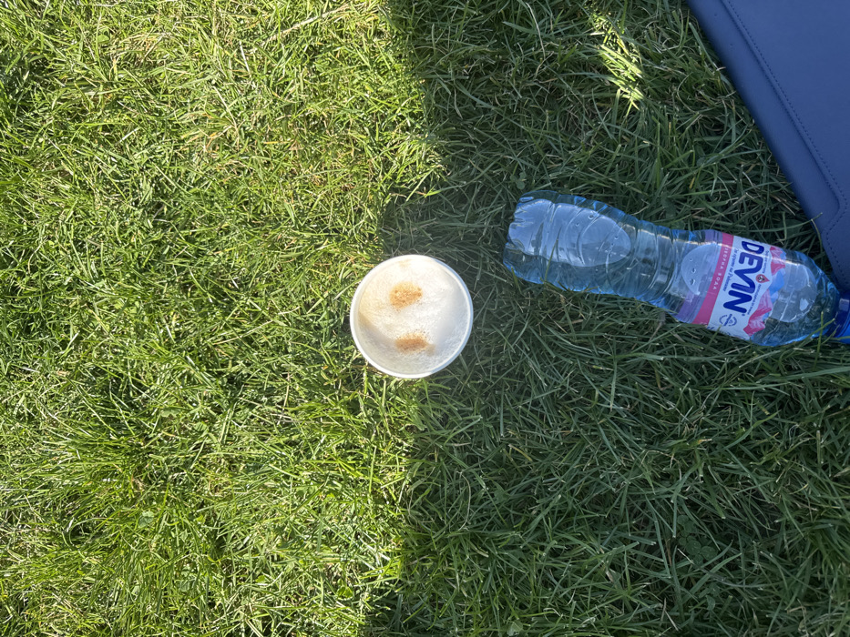 The scene is an overhead view of green grass, indicative of a lawn or park environment in Blagoevgrad, Bulgaria. Strong sunlight illuminates the grass, casting a discernible shadow line diagonally across the upper right portion of the image. Centrally positioned, a white disposable cup contains a light-colored beverage, likely coffee, topped with foam featuring two distinct, circular, light brown markings. To the lower right of the cup, a transparent blue plastic bottle, partially filled with water, lies horizontally on the grass. The bottle's label clearly displays "DEVIN," identifying it as a Bulgarian mineral water brand. A dark blue, flat object, possibly a bag or mat, is partially visible along the bottom right edge of the frame. No individuals are present.