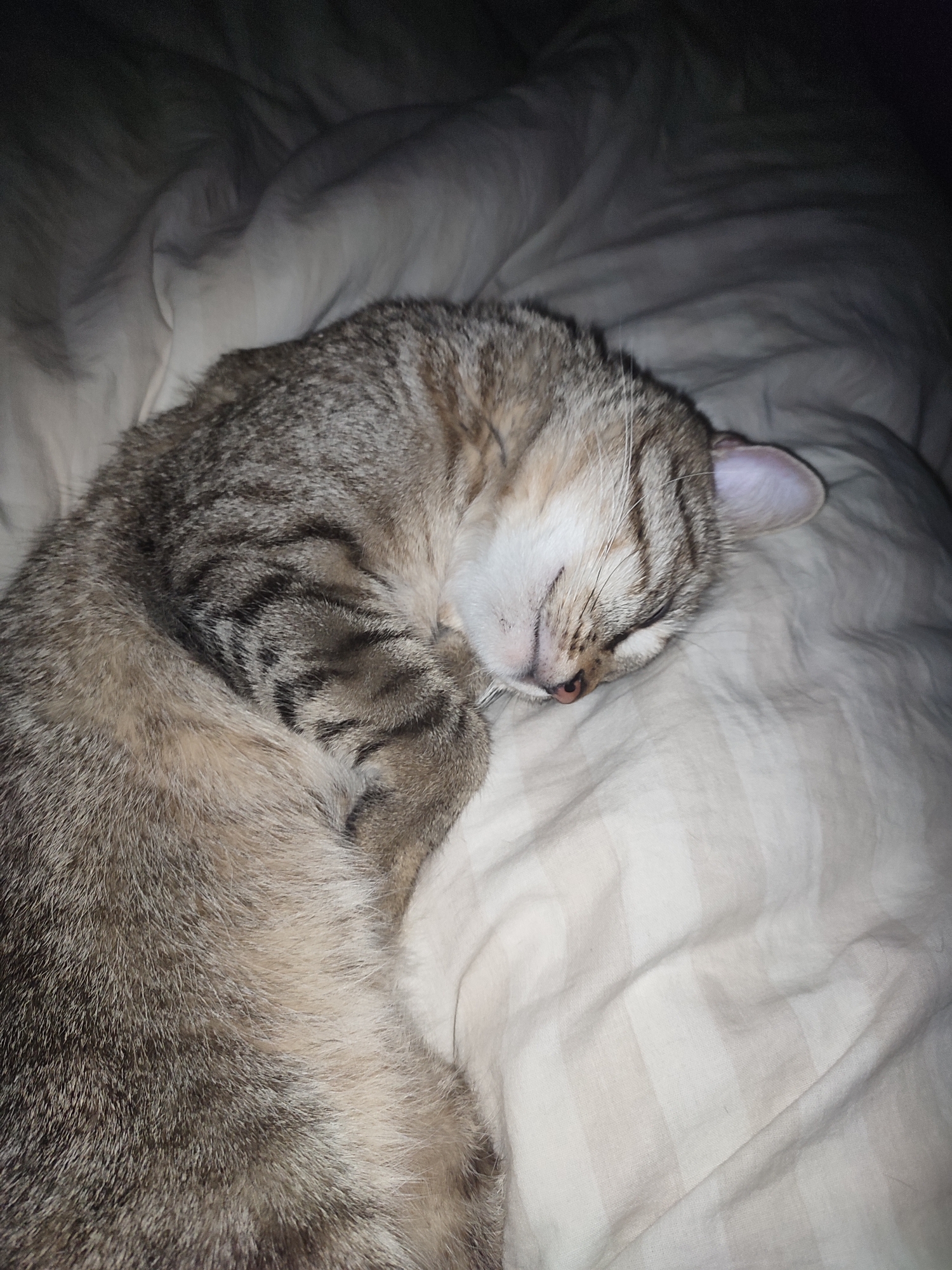 - "A tabby cat is curled up and sleeping on a white, striped duvet" by FM-sBAuS2, licensed under CC BY 4.0