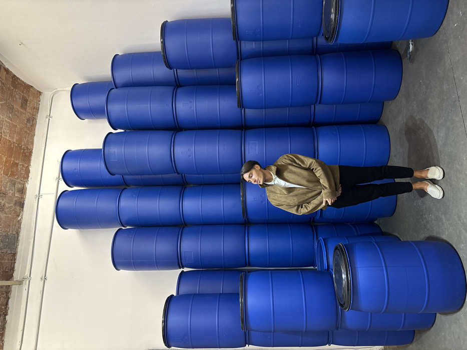 A person in a tan jacket, black pants, and off-white shoes lies on a horizontal stack of blue barrels. The barrels are arranged in a staggered pattern, reaching a high point and descending towards the floor. A brick wall and a white wall are visible in the background. The barrels are tightly packed and take up most of the image.