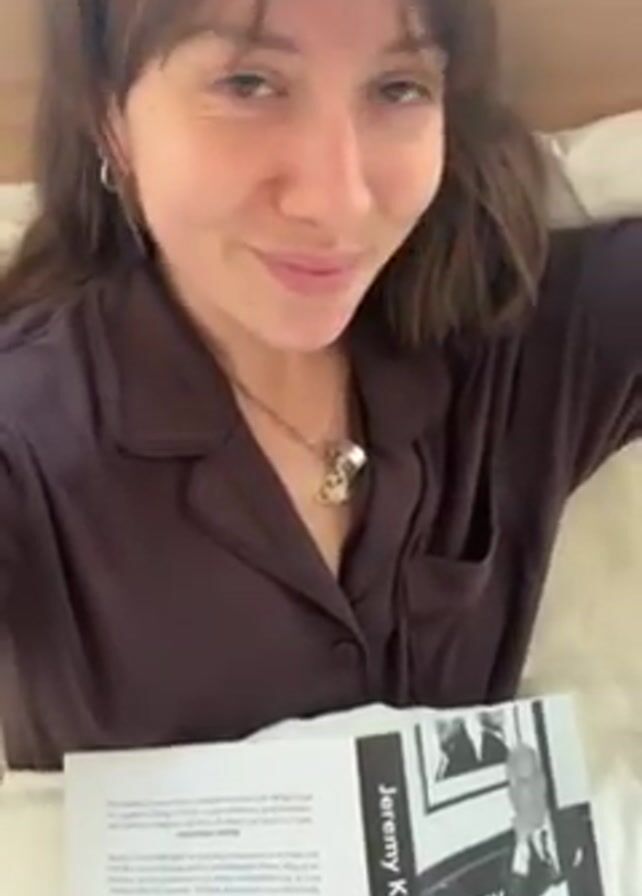 A woman with long, dark brown hair and bangs is lying in bed, holding open a book titled "Jeremy King Without End." She is wearing a dark-colored, long-sleeved pajama top, small hoop earrings, and a necklace with charms. She has a small tattoo of a lightning bolt on her left wrist. The woman looks at the camera, touches her hair, and rests her face in her hand. Behind her, a window is visible with framed artwork on the wall.