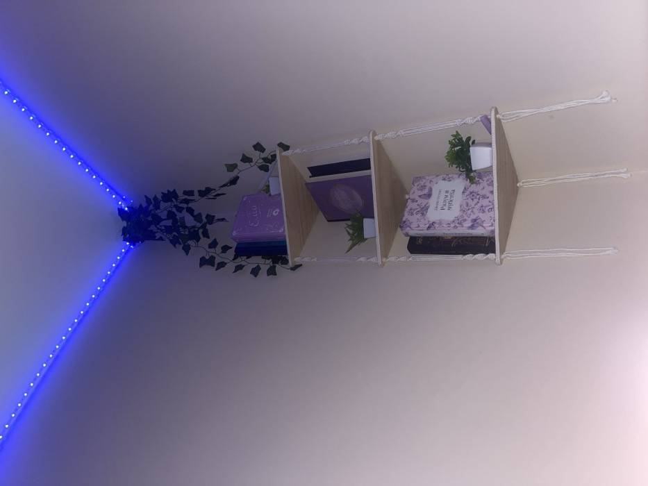 An interior corner of a room in Smyadovo, Bulgaria, is depicted. Blue LED strip lights are installed along the ceiling perimeter, illuminating the space with a bluish hue. An artificial ivy vine hangs from the ceiling in the corner. Below it, a three-tiered corner shelf unit is suspended by white macrame-style ropes. Each shelf is a triangular piece of light-colored wood. The top shelf holds three books; one prominent book has a purple cover with "Ella" visible on its spine, alongside a small artificial succulent plant in a white pot. The middle shelf contains two books, one appearing purple, and another small artificial succulent plant in a white pot. The bottom shelf displays two books, one featuring a light purple cover with a floral and butterfly design and Cyrillic text "Джейн Остин Разум и чувствителност" (Jane Austen, Sense and Sensibility), positioned next to a third small artificial succulent plant in a white pot. The walls are light-colored. No individuals are present in the scene.