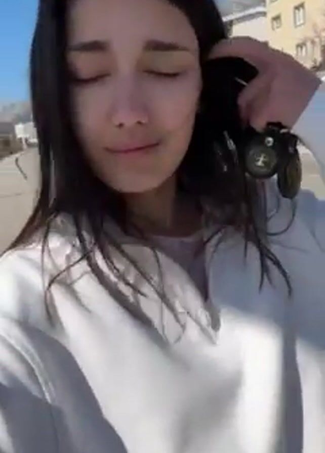 A young woman with long, dark hair and light skin is standing outside, facing the camera