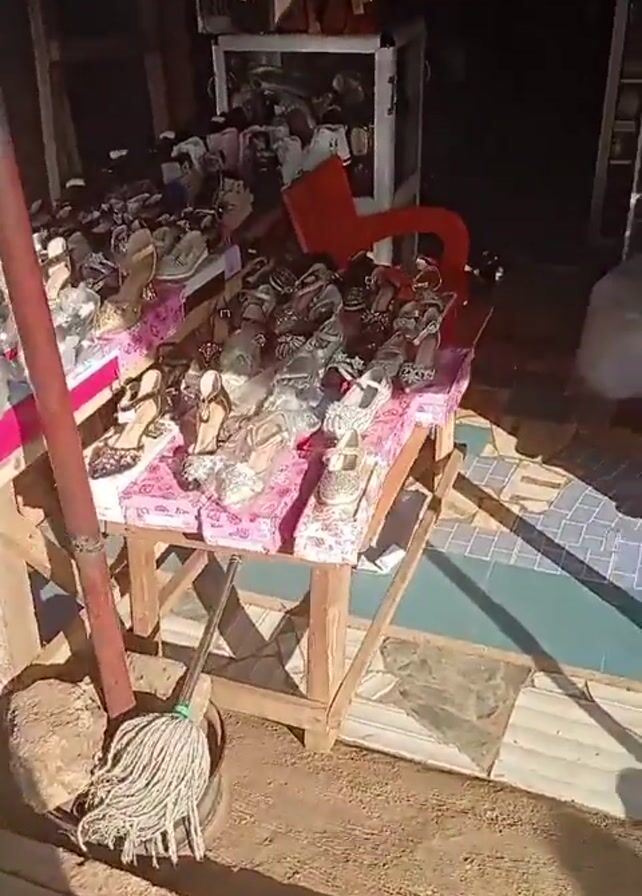 small shop selling women's shoes and bags. The shoes are displayed on a table covered with a pink and white floral tablecloth. There is a red plastic chair, a mop, and various bags hanging from the ceiling. The shop seems to be located outdoors with a tiled floor. The light is bright, suggesting a sunny day.