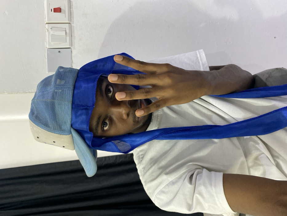 A person with dark skin is wearing a white shirt, a blue du-rag and a trucker hat tilted to the left. The individual is looking at the camera and has their right hand raised with their fingers partially obscuring their face. In the background is a white wall with light switches and a black curtain or fabric. The image appears to be taken indoors.