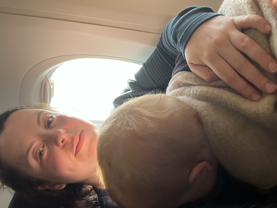 The image displays an adult female holding an infant within the interior of an aircraft cabin. The adult female, visible from the chest up, has dark hair and a neutral expression, looking directly forward. She wears a dark, striped long-sleeved garment. An infant, with blond hair, rests its head against her chest, facing away from the camera, largely obscured by a light beige blanket. The adult's left hand is visible, resting on the blanket. An oval aircraft window to the right of the subjects shows bright daylight, backlighting the scene. The specific geographical location within Babergh, United Kingdom, cannot be determined from the visual evidence provided.