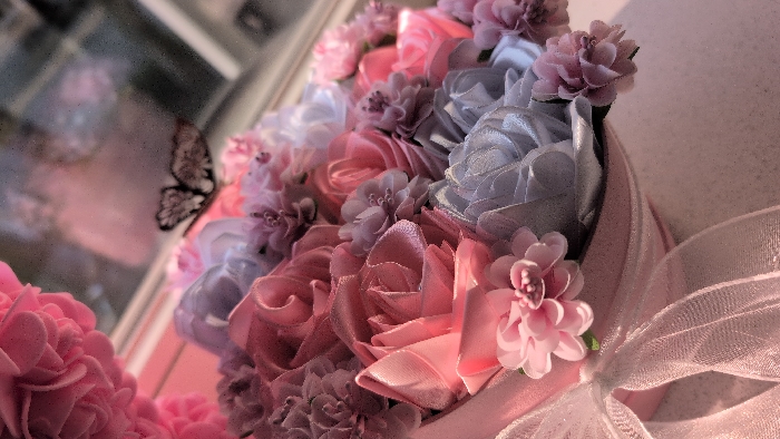 - "The image displays a close-up, angled view of an artificial floral arrangement contained within a light pink, cylindrical box" by FM-uRvbP2, licensed under CC BY 4.0