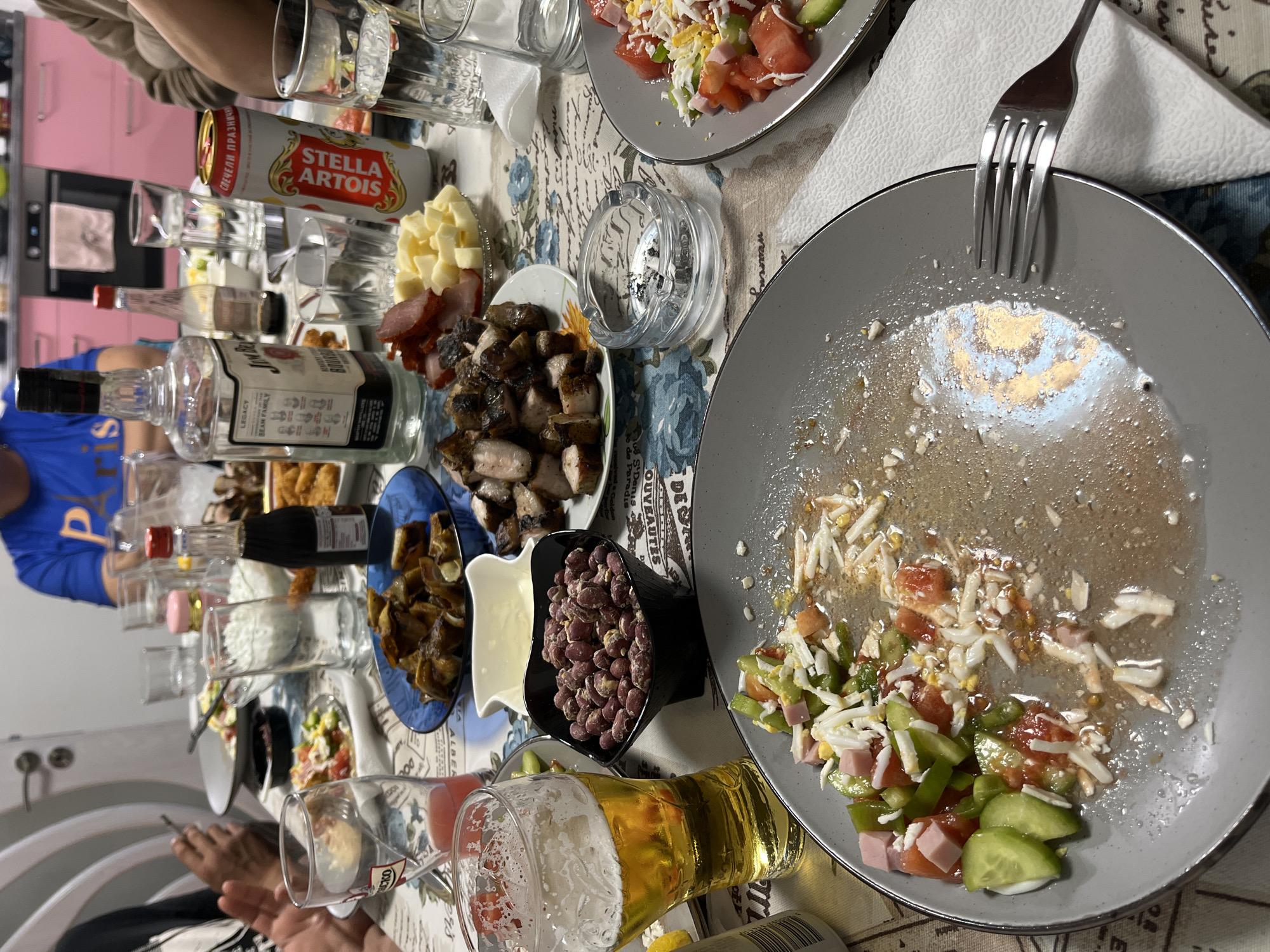 The scene is a close-up shot of a table laden with food and drinks, likely a shared meal in progress. Dishes include salad, grilled meat, cheese cubes, and a bowl of what appears to be beans. Beverages present are beer (Stella Artois is visible), a pink-colored drink, and liquor in bottles (one labeled "Jim Beam"). An ashtray sits among the dishes, and plates show signs of being partially eaten. A fork rests on one plate. A few people are partially visible around the edges of the frame, suggesting they are seated at the table. The tablecloth has a floral pattern. It is not possible to determine if the location is Karavelovo, Bulgaria from the provided image.